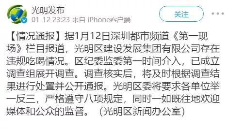 據1月12日深圳都市頻道《第一現場》欄目報道,光明區建設發展集團有限公司存在違規吃喝情況。區紀委監委第一時間介入,已成立調查組展開調查。調查核實後,將及時根據調查結果進行處置並公開通報。光明區委將要求各單位舉一反三,嚴格遵守八項規定,同時一如既往地歡迎媒體和公眾的監督。