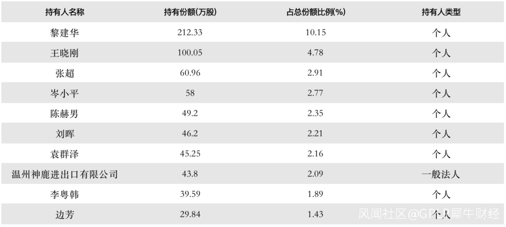 其中,黎建華為第一大持有人,佔比10.15%;温州神鹿進出口有限公司是唯一一個進入前十的非自然人,排在第八名的袁澤羣正是其實際控制人,二者合計持有比例為4.25%。