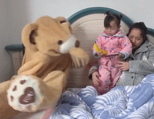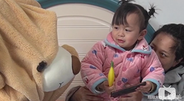 進門後,小乖馬上注意到了小翔哥扮的熊。媽媽把小乖放在牀上,小乖顯得很抗拒,一直説“不要”,想出去。