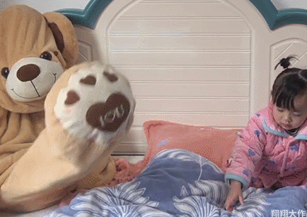 其實,一般的整蠱視頻到這裏就達成目的結束了,但小翔哥表示,孩子並不是被熊嚇哭的,而是因為一個人在房間生氣才哭的: