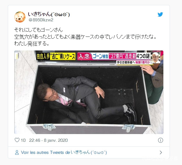 還有一些網友上傳惡搞圖片:樂器盒或箱子上貼有戈恩的肖像,下面的文字卻提示道“戈恩不在裏面”。
