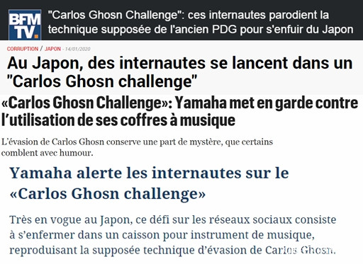 管它是琴套還是紙箱子,一場“扮演戈恩”的遊戲就這樣開始了。值得一提的是,這項挑戰在戈恩逃出生天的日本尤其流行。網民玩出了新花樣,《費加羅報》、《巴黎人報》、“BFMTV”等一眾法國媒體紛紛排隊吃瓜。
