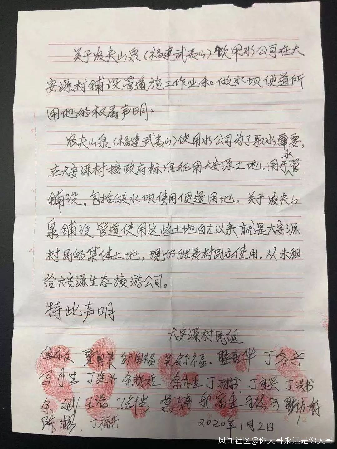 此外,大安源村民小組還出示了一份權屬聲明,證明從未將土地租借給大安源生態旅遊有限公司。農夫山泉取水管道鋪設和取水口的土地為大安源村民組所有,與大安源生態旅遊有限公司無關。