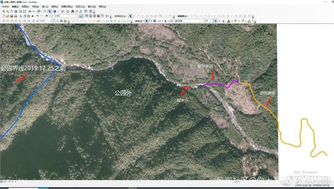 説明:底圖為武夷山國家公園製作於2018年1月的航拍圖。圖中藍線為武夷山國家公園原界線,紅色圓圈為取水點,紫色線條為開設的便道,棕色線條為大安源小組原有生產便道。