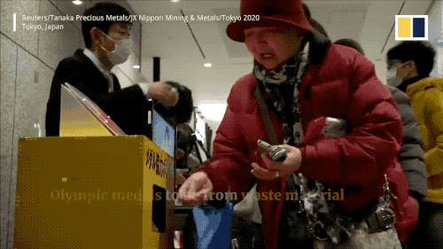 從手機電路板裏回收的金銀銅,就被回爐再造,煉成了獎牌。