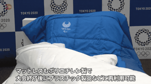 牀架是紙板的,牀墊呢是聚乙烯,就是塑料袋的那種塑料做的,按照頭胸腿分割成了三塊,比賽結束後也要回收,重新制成塑料製品。點我查看回收的塑料瓶怎麼被做成衣服。