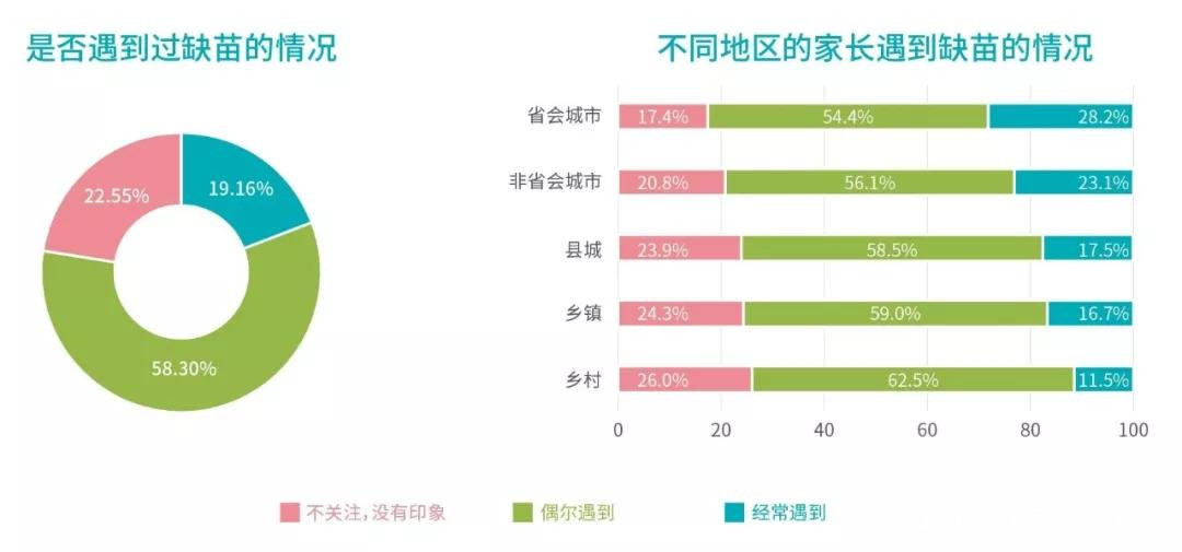 調查顯示,約77%的家長遇到過疫苗缺貨的情況,約19%的家長經常遇到。按地區分析顯示,經濟越發達的地區有越多的家長表示遇到經常遇到缺苗的情況,28.2%省會城市的家長表示經常遇到缺苗的情況。