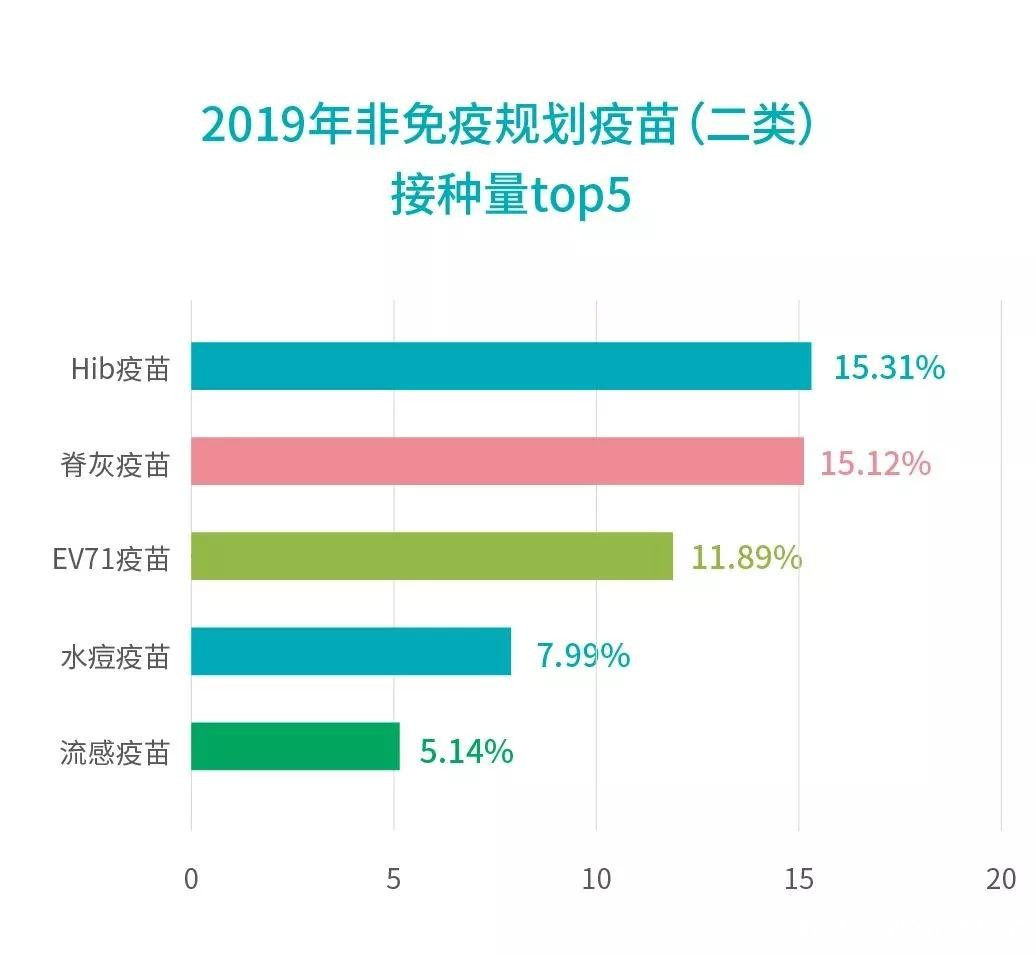 2019自費疫苗接種量TOP5依次為:Hib疫苗、脊灰滅活疫苗、手足口疫苗、水痘疫苗、流感疫苗。2019年,脊灰疫苗衍生病毒出現,國家啓動了應急響應機制,開展脊灰疫苗強化接種。受此影響,脊灰滅活疫苗在2019年的自費疫苗接種量排名中升至第二。
