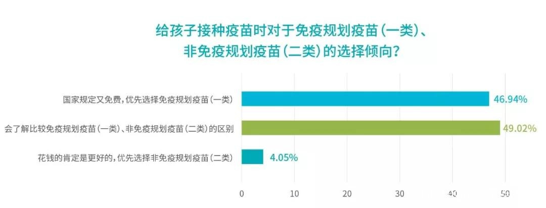 約46%的家長明確表示會優先選擇免費疫苗,約49%的家長會了解對比兩者的區別再決定如何選擇,僅有約4%的家長明確表示會優先選擇自費疫苗。