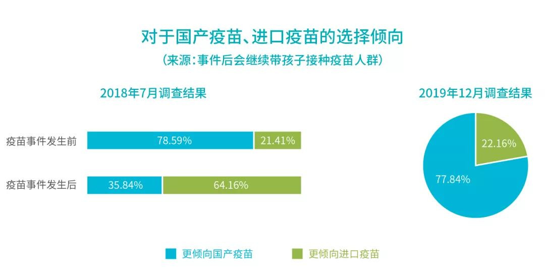 而在此次的調查中發現,更傾向選擇國產疫苗的家長佔比回升至77.84%。顯示中國家長對於國產疫苗的信心基本恢復至“長春長生疫苗事件”爆發前的水平。