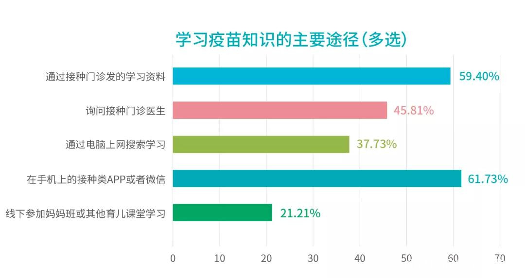 調查顯示,超過6成的家長主要通過手機上的預防接種APP或者科普公眾號學習疫苗接種知識,表明移動互聯網超過其他傳統的疫苗科普渠道,成為家長學習疫苗接種知識最主要的渠道。