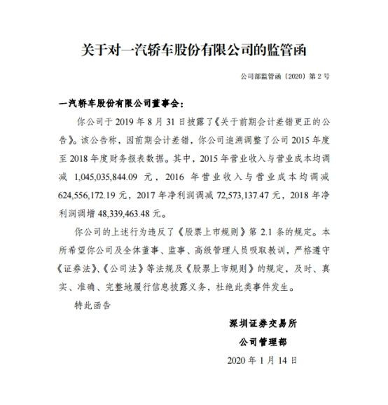 1月14日晚,一汽轎車(000800.SZ)發佈深交所對該公司的監管函公告,針對一汽轎車連續4年出現年報數據差錯給予批評,要求該公司嚴格遵守《證券法》、《公司法》等法規及《股票上市》的規定,及時、準確、完整披露財報信息,並杜絕此事發生。