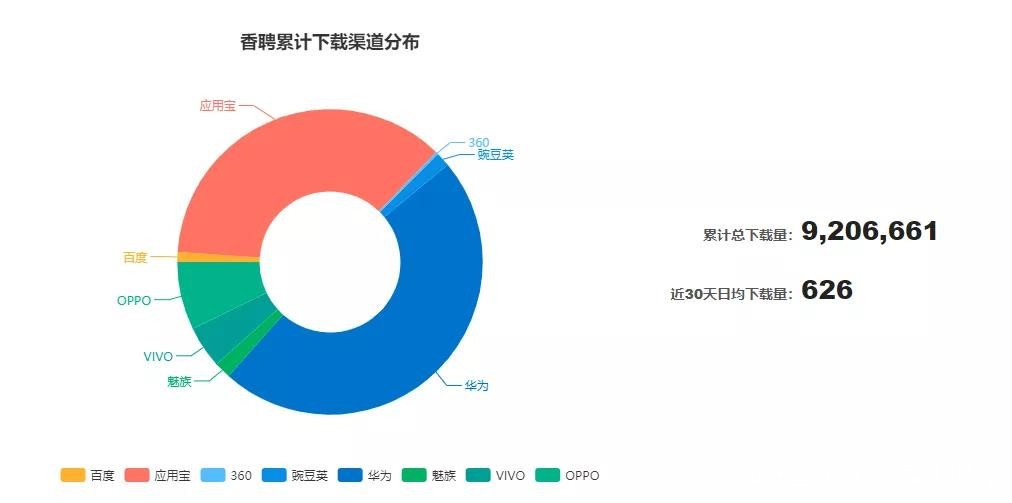 根據七麥數據這個手機APP統計網站數據顯示,香聘近30天內日均下載量626次。