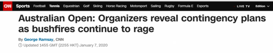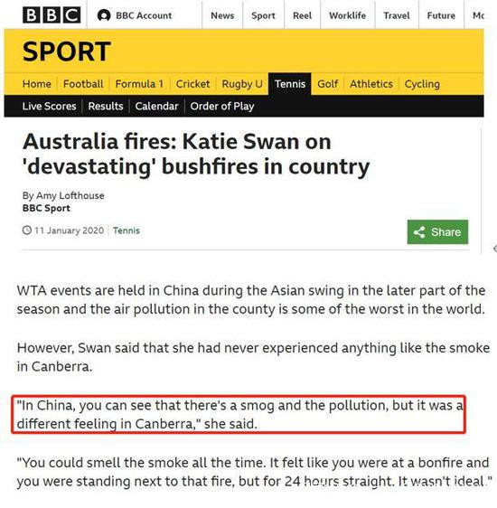 1月11日,英國BBC新聞刊登了一則英國網球運動員凱蒂⋅斯萬對澳大利亞山火看法的新聞。