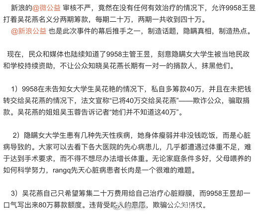 在媒體和網友的質疑下,9958 在 14 日晚上 18 點發出了一個聲明,辯解是因為吳花燕身體太差,短時間內不能接受手術,並且是在吳花燕家人以及政府的建議下,所以只給了醫院一小筆費用。