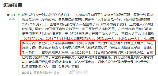 2019年11月4日,9958救助中心轉款2萬元(微公益平台1萬元,水滴公益平台1萬元)至醫院,用於吳花燕的治療。而後,**結合當地政府啓動救助機制的現實情況,吳花燕及家屬同時提出捐款使用意向需求:餘下款項希望預留至手術和康復治療再使用(經核實,吳花燕病情有反覆,尚未達到手術條件),因此餘下善款未能撥付至醫院。**2020年1月13日,9958救助中心得到吳花燕突然因病去世的消息。