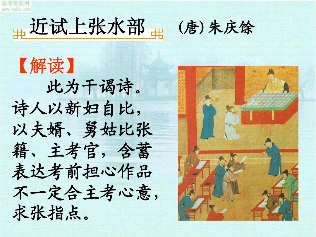 “近試”,是指接近科舉考試。也就是説,朱慶餘身為進京趕考的舉子,在接近科舉考試的時候,給張籍寫了這樣一首詩。顯然,詩的內容應該不只是表面的閨房之樂那麼簡單,可能會與考試有關。