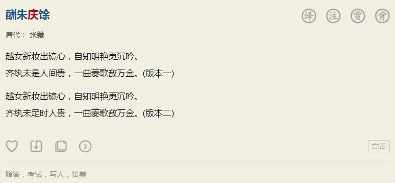 這樣一來,《酬朱慶餘》整首詩的意思也出來了。關鍵也是最後一句話“一曲菱歌敵萬金”,意為你的詩文很符合主考官禮部侍郎楊嗣復的口味,可敵萬金。