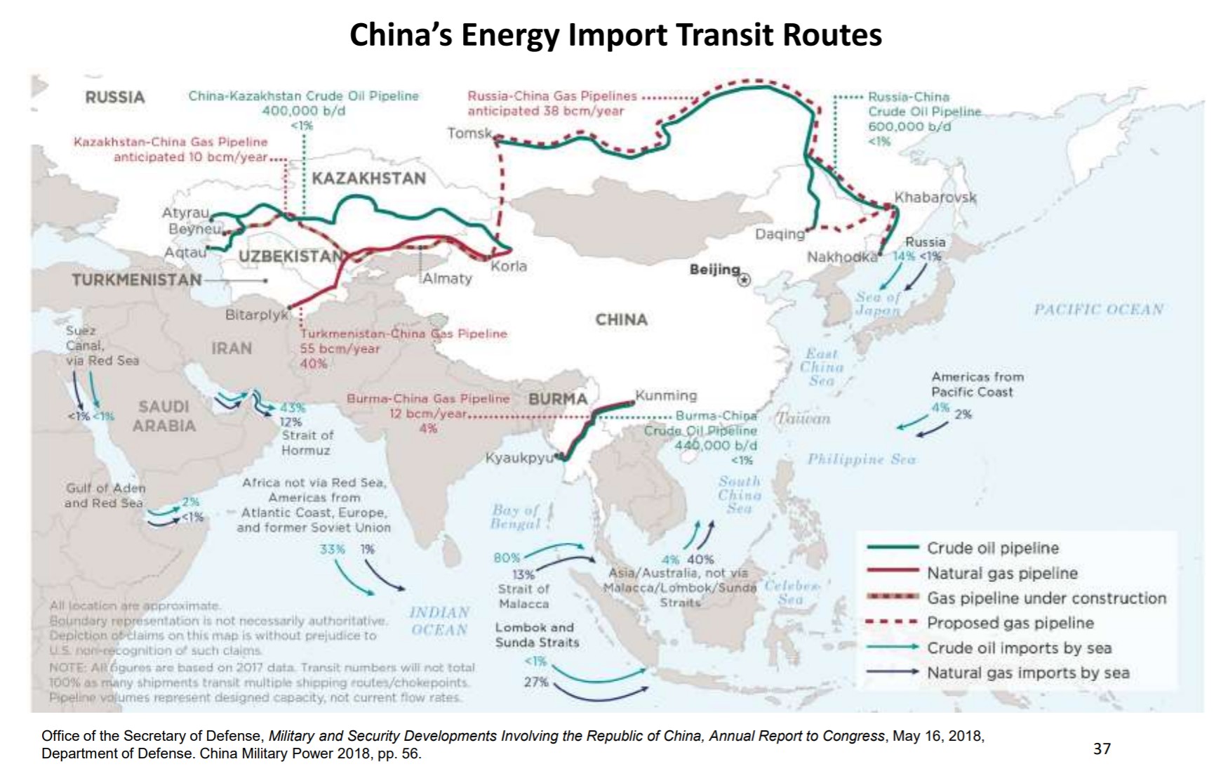 中國石油、天然氣進口來源分佈圖示。地圖上的國境當然不是中國官方認可的,比如説,阿克賽欽被標到印度去了,但不影響對石油進口來源的示意。有點不解的是,管道的輸油能力相對於總需求來説很低,哈薩克、俄羅斯和緬甸都只有不到1%,大頭還是海運,包括俄羅斯遠東(15%)。石油進口有33%來自非洲和大西洋,可能主要還是非洲;加上中東,有80%要經過馬六甲海峽。液化天然氣則有27%走龍目海峽和巽他海峽,其中大頭應該來自澳大利亞,但40%從其他方向過來,包括文萊、馬來西亞和澳大利亞。有意思的是,俄羅斯似乎不願意建造穿越蒙古的管道,或許是油氣田的地理位置的關係,也可能是地緣政治的關係