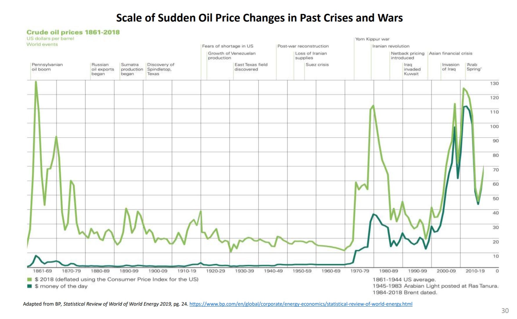 按照2018年不變價格(淺綠)和當年美元(深綠),歷年石油價格如圖所示。可見19世紀末,石油開採技術高速發展,石油價格雪崩式滑落。這也是美國石油(尤其是賓夕法尼亞)大開發的年代。裏海石油和印尼石油在19世紀最後20年裏相繼開發。德克薩斯石油在20世紀00年代開始開發,20年代加入委內瑞拉石油,50年代伊朗石油國有化和蘇伊士運河國有化,但整個20世紀前70年裏,除了一戰時代,以2018年美元的不變價格計算,石油價格並無太大的波動。但70年代石油危機着實飆升了一把,但伊朗伊斯蘭革命才是真的火箭式上升,以後再也沒有回落到“過去的好時光”。但海灣戰爭把石油價格推高一下後,整個90年代裏,石油價格是不斷滑落的,直到1997年亞太金融危機時大升了一把。但此後的反恐戰爭才是真正的飆升,直到阿拉伯之春和克里米亞危機導致暴跌。近年來正在恢復,實際上恢復到石油危機時的高位了,但離最高位還差很遠