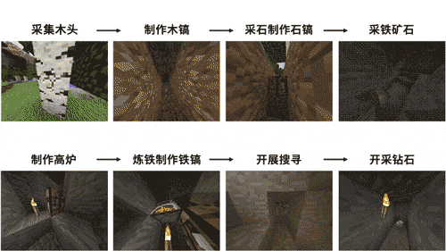 為了拿到鑽石,由AI控制的玩家(或稱智能體)在MineRL競賽中需要掌握的技能有點多。首先,它們需要採集木頭和鐵來製作鎬;然後製作火把照亮前路;它們可能還要帶上一桶水來撲滅地下的岩漿。當這些都齊備之後,AI才能開始在礦井和山洞裏探索,同時在地下挖掘鑽石礦。