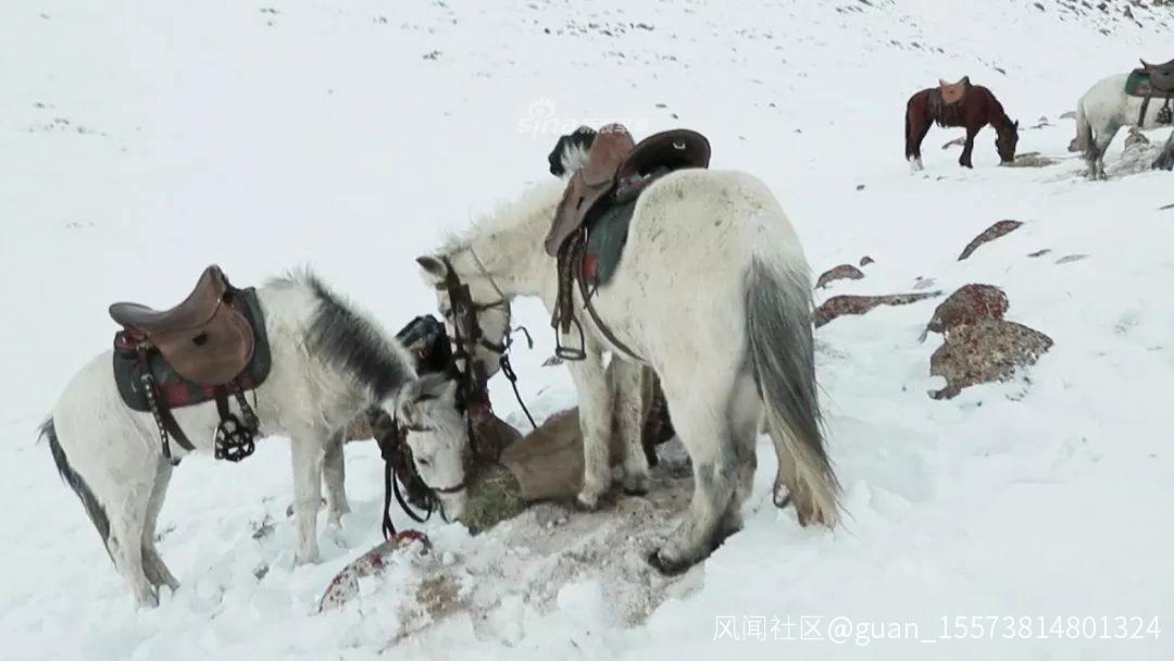 越往上走,積雪越深,有的地方都沒過了膝蓋,幾匹軍馬也一度被困雪坑,不能動彈。艱難行進了4個多小時後,巡邏隊伍終於到了休息點。顧不上吃飯,軍馬飼養員格加忙着挨個給軍馬餵馬草。