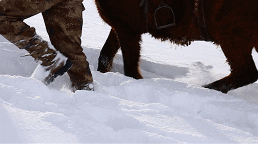越往上走,積雪越深,有的地方都沒過了膝蓋,幾匹軍馬也一度被困雪坑,不能動彈。艱難行進了4個多小時後,巡邏隊伍終於到了休息點。顧不上吃飯,軍馬飼養員格加忙着挨個給軍馬餵馬草。