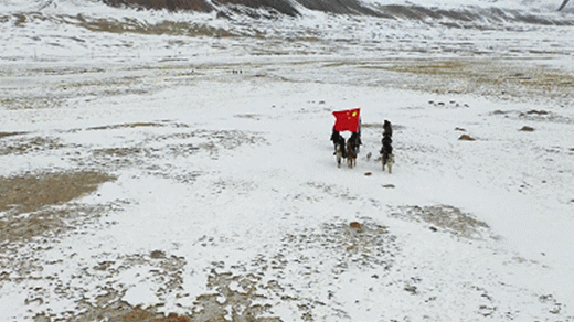穿過冰河,來到一片較為平坦的草原,大家策馬揚鞭,加快行軍速度。突然,戰士阿里木從馬背上摔了下來。官兵們要到達海拔5250米的巡邏點位,途中要翻越兩座5000米以上的雪山達坂。隱藏在積雪下方的不僅有光滑的冰面,還有大大小小的雪坑和旱獺洞。