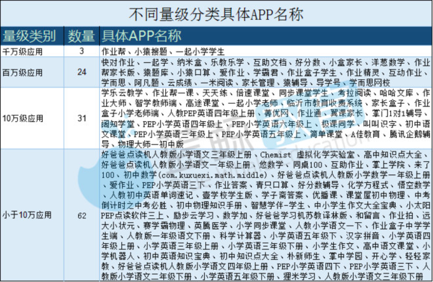 數據顯示,在所有活躍的中小學教育APP中,僅有三家達到千萬級用户規模的APP,“作業幫”遠超“小猿搜題”、“一起小學學生”位居第一;百萬級用户規模APP則有 24個,如“學樂雲教學”、“作業幫直播課(原名作業幫一課)”、“天天練”、“倍速課堂”、“同步課堂學生”等。可見,主打拍照搜題和在線直播課的作業幫、作業幫直播課已成為用户規模大、滲透率高的在線教育明星產品。