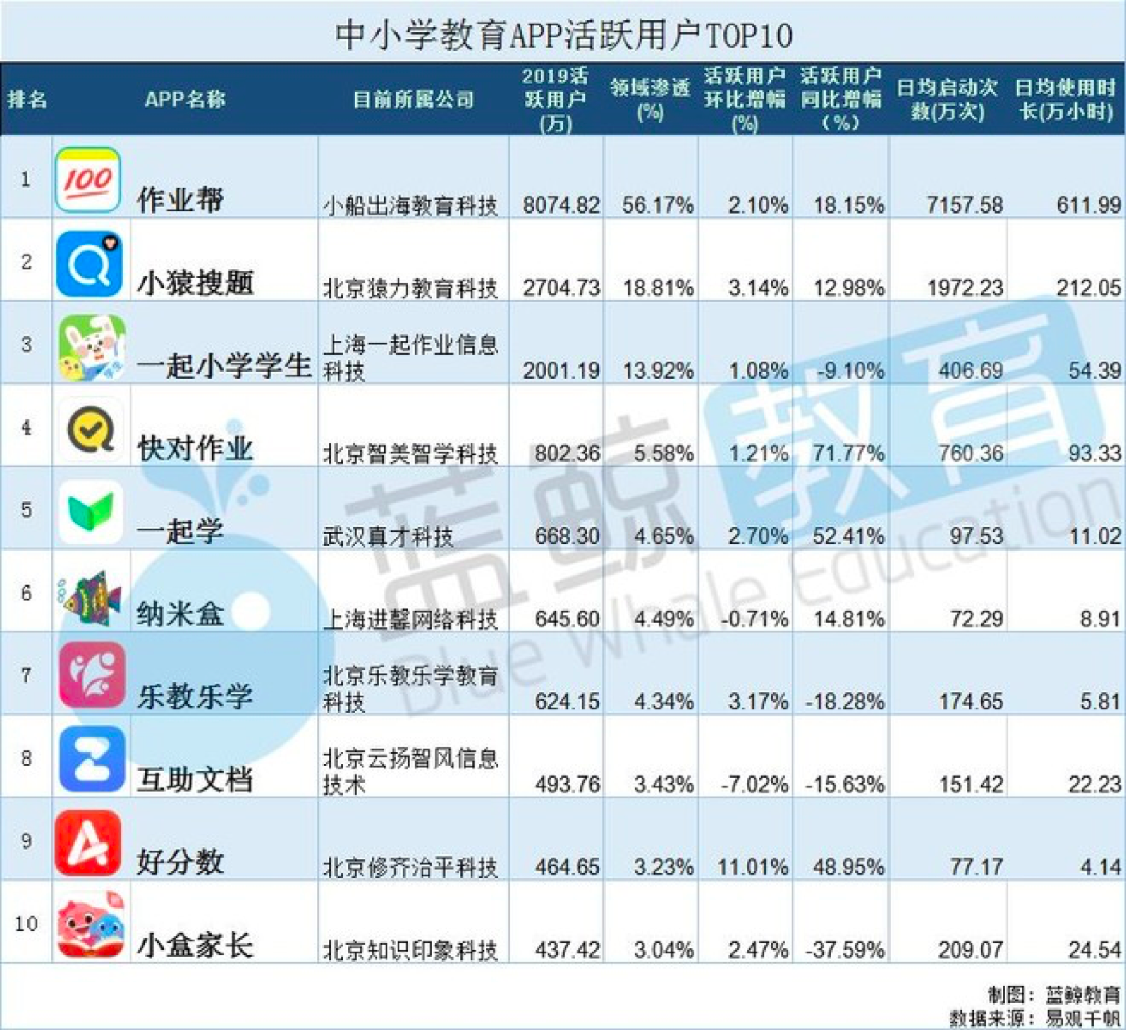 近日,藍鯨教育攜手易觀千帆發佈2019中小學教育APP排行榜,圍繞120箇中小學教育類活躍APP進行分析和競爭力考察。其中作業幫APP以遠超二到十名總和的用户規模位居榜首,連續三年拿下K12在線教育“C位”。