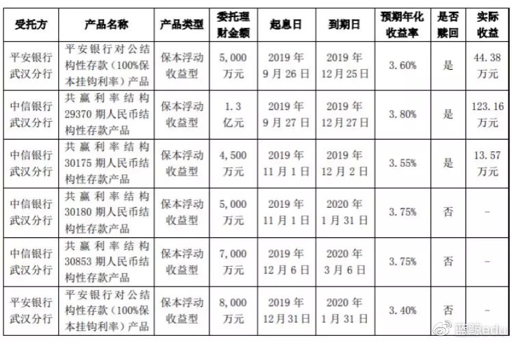 2019年12月31日,天喻信息公告稱已向平安銀行武漢支行購買8000萬元保本浮動收益型對公結構性存款產品。於當日起息,到期日為2020年1月31日,預期年化收益約為272萬元。而截至該公告日,天喻信息已多次使用自有資金購買保本浮動收益型理財產品,目前持有的理財產品金額合計高達2億元。
