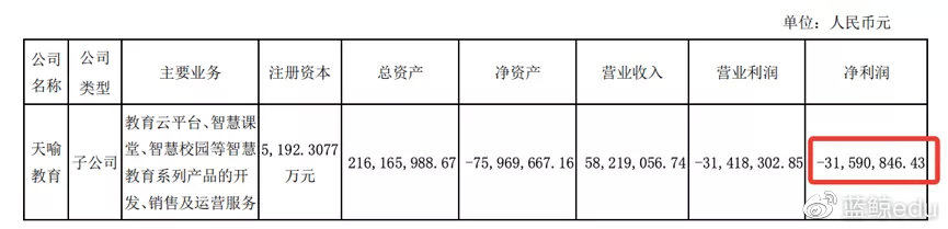 而負責天喻信息數據安全、智慧教育、移動支付服務三大主營業務之一的教育業務、為其帶來主要收益的控股子公司天喻教育,2018年終結了前兩年連續虧損的情況下,2019年或將再度陷入業績困局。