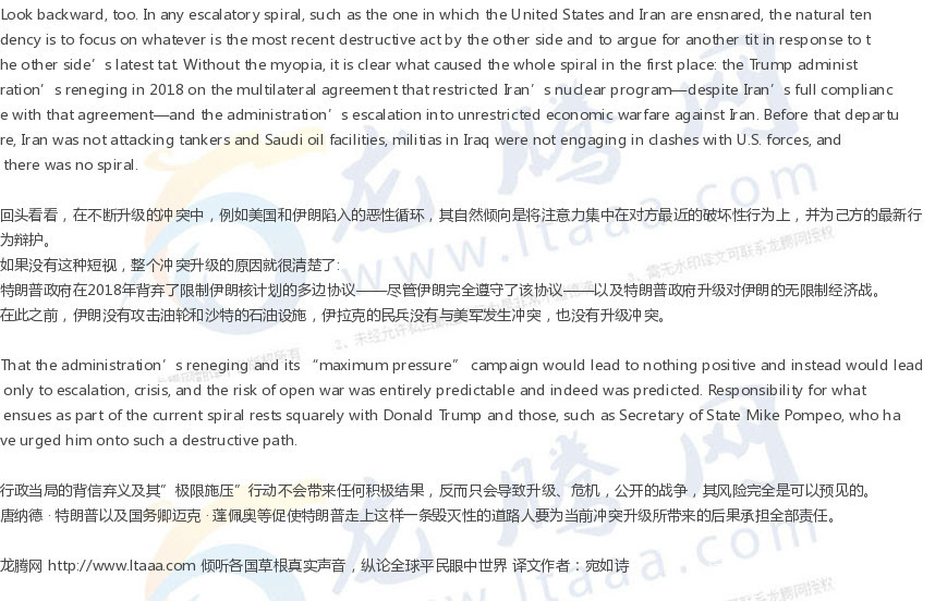 “如果特朗普和蓬佩奧想要脱離這個階梯,他們需要做的不僅僅是口頭上説要下台階,他們必須做出有效的緩和,不僅意味着放棄更具挑釁性和致命性的動能行為,還意味着放棄開啓破壞性循環的經濟戰。”