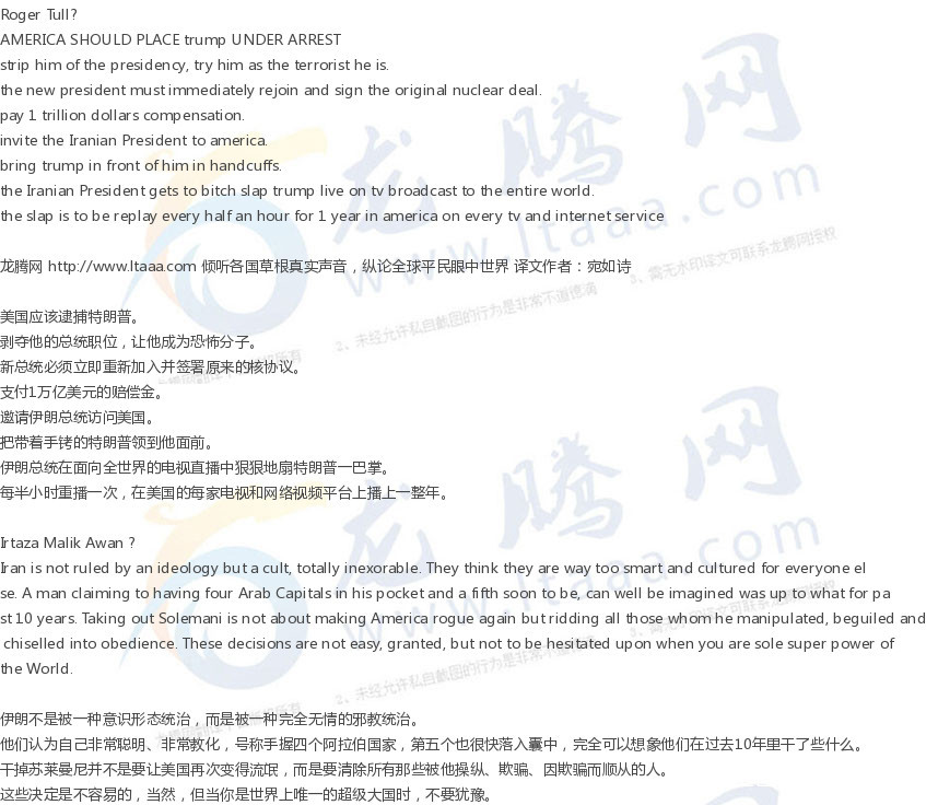 阿亞圖拉們(對伊朗等國伊斯蘭教什葉派領袖的尊稱)支持像真主黨這樣的恐怖組織,他們為塔利班、哈馬斯、巴勒斯坦伊斯蘭聖戰組織組織等各色墮落分子提供支持,伊朗越早變得不那麼激進,越早擺脱精神毛拉越好。
