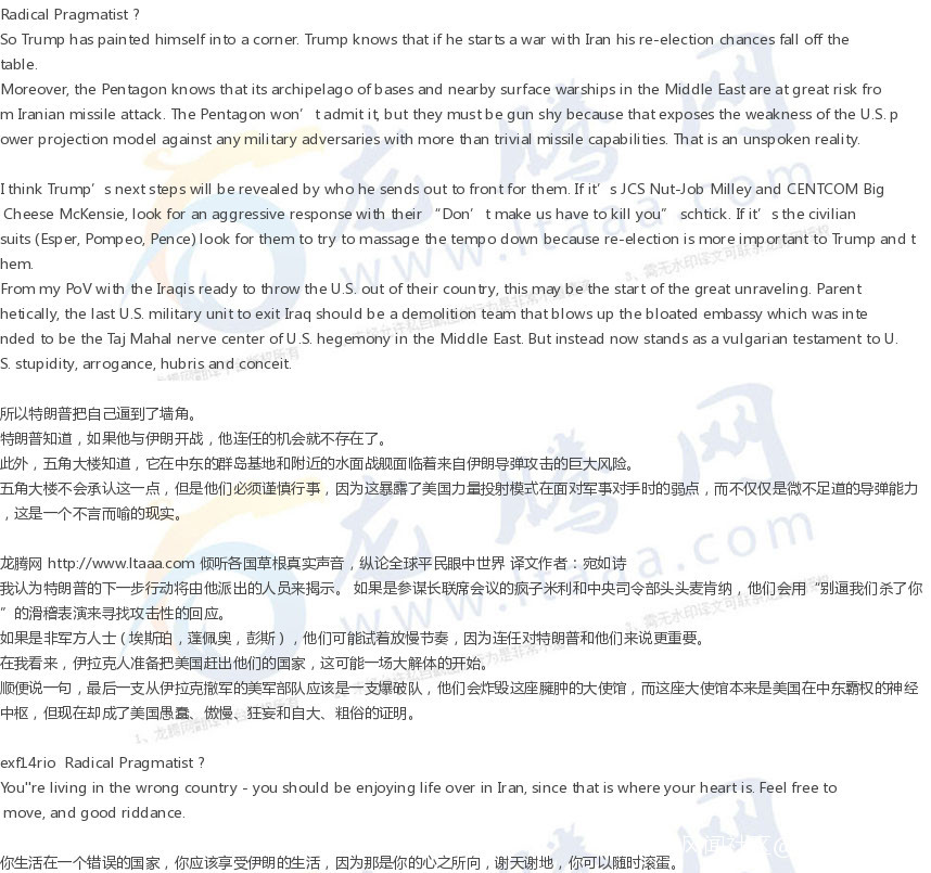 “If Trump and Pompeo really want to get off that ladder, they need to do more than just say they want de-escalation. They actually need to de-escalate. That means not only backing off from more provocative and deadly kinetic acts; it also means backing off from the economic warfare that started the destructive cycle.” white flag ? surrender ?