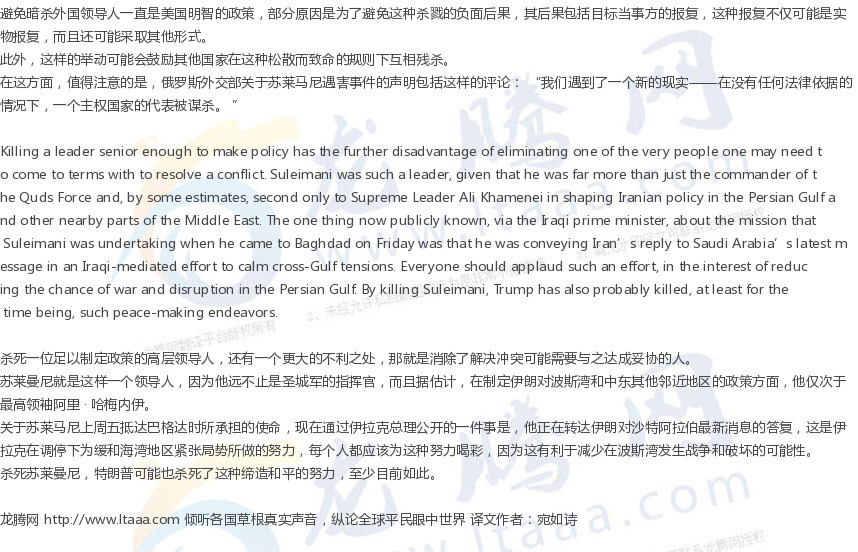 譯文簡介:暗殺伊朗少將卡西姆 · 蘇萊曼尼,以及為這次暗殺編織的理由,無論從時間還是空間的角度來看,都表現出極度的短視。