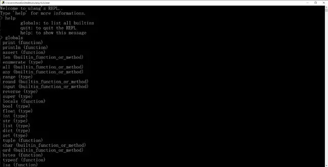 對於「國產語言」,大家的期待都非常大,很多開發者都下載了 ulang-0.2.2.exe「木蘭」語言環境。打開木蘭語言環境後,首先呈現的是類似命令行的編程環境,我們會發現它的函數很多都和 Python 一致。在編程界面中,鍵入 help 就能看到一些相關信息,不過我們並沒有找到更多的編程語言文檔。
