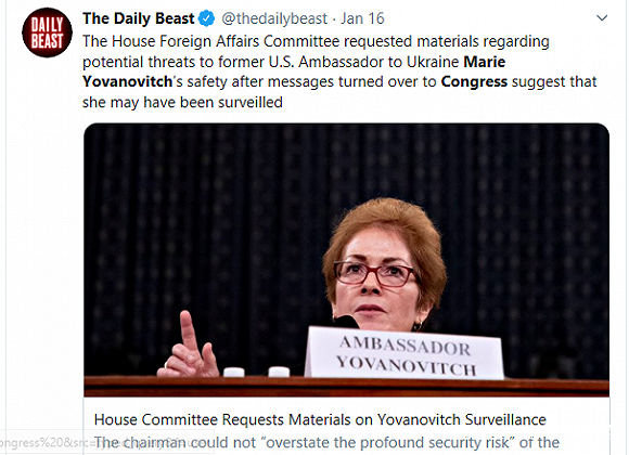 目前,美國眾院外交事務委員會已向國務院發出正式信函,要求調查“約萬諾維奇可能曾被威脅”一事。委員會主席安格爾(Eliot Engel)表示:“短信內容強烈暗示,有人掌握了大使行蹤和安保的詳細信息,並將信息實時提供給了帕納斯和海德。”安格爾認為,這對美國外交人員的安全和美國的利益帶來了重大風險。