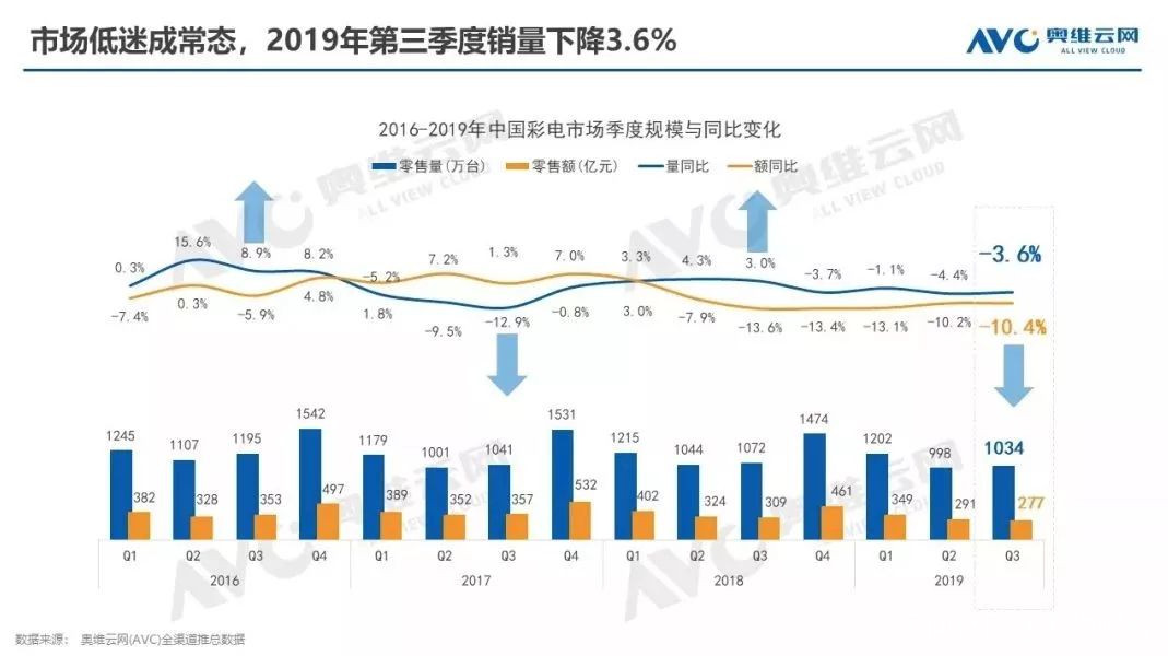 據奧維雲網聯合中國電子視像行業協會發布的2019年中國彩電市場第三季度總結報告顯示,中國彩電市場零售量1034萬台,同比下降3.6%;零售額277億元,同比減少10.4%。彩電市場自2018年第四季度以來至此,連續第四個季度下滑,低迷成為常態。