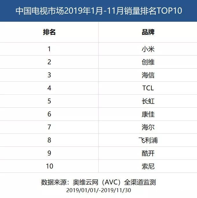 據奧維雲網發佈的中國電視市場2019年1月-11月銷量排名顯示,前五名分別為小米、創維、海信、TCL、長虹。