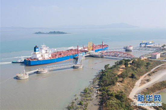 1月13日,一艘油輪停靠在緬甸皎漂馬德島中緬油氣管道項目卸油碼頭,準備卸載石油(無人機拍攝)。 新華社記者 杜宇 攝