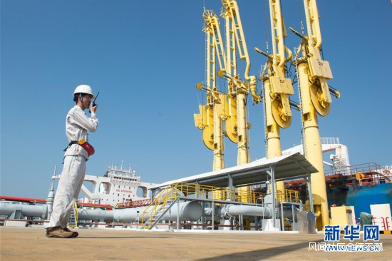 1月13日,在緬甸皎漂馬德島中緬油氣管道項目卸油碼頭,一名中石油工程師指揮卸油工作。 新華社記者 杜宇 攝