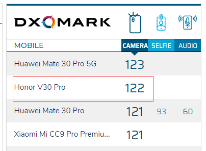 今天下午還在説榮耀V30Pro送測DXO這茬,現在評分已經出來了:122分,正好一分吊打小米CC9Pro……