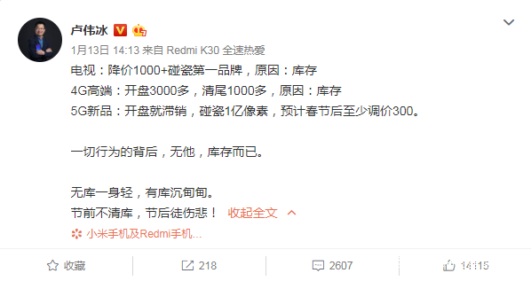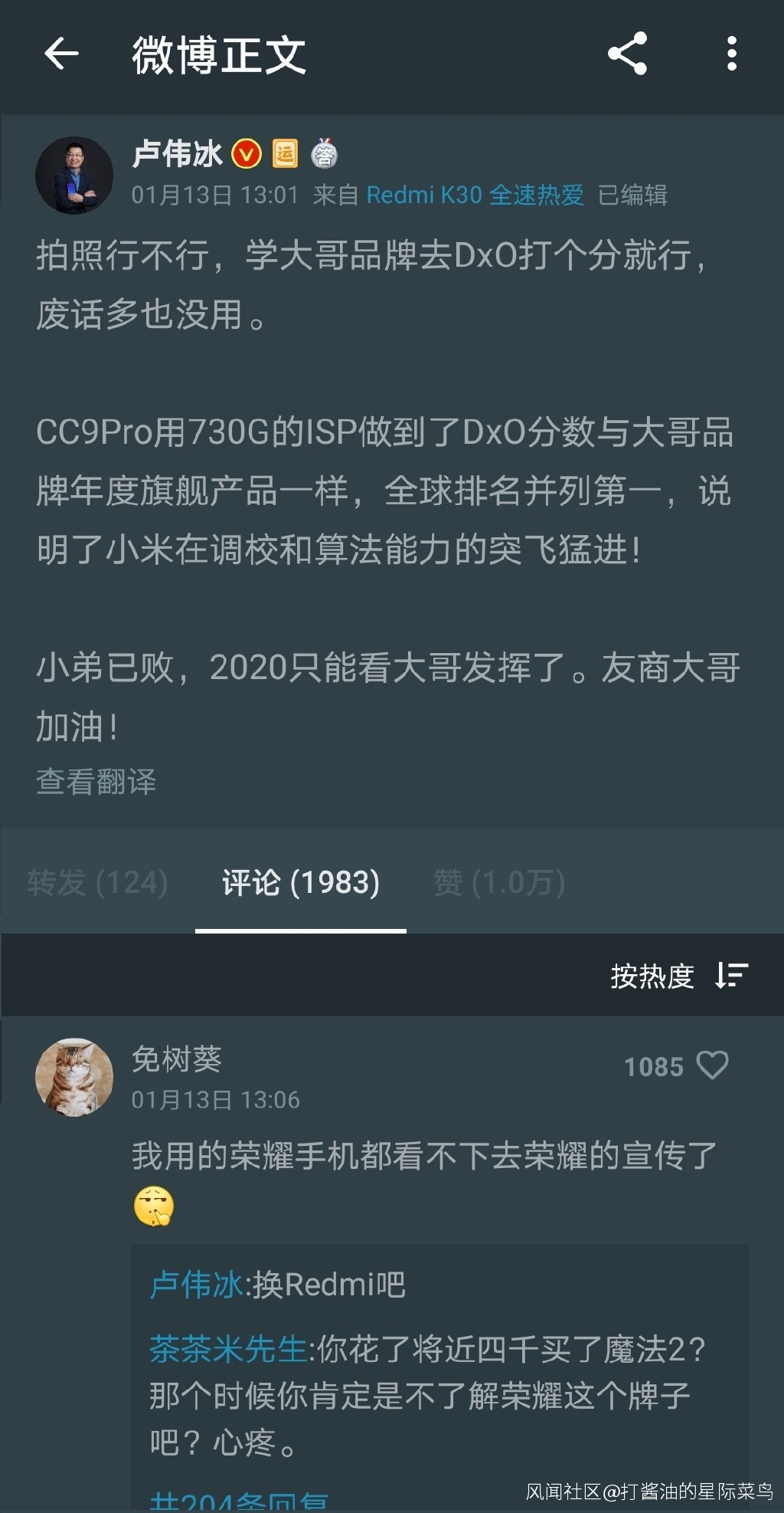 進入2020年,熱衷在網上與網友互動“科普”,並不斷對“友商”產品評頭論足的小米集團副總裁,中國區總裁,紅米Redmi品牌總經理盧偉冰,對主要競爭對手榮耀的“科普”和“吐槽”就沒停過。