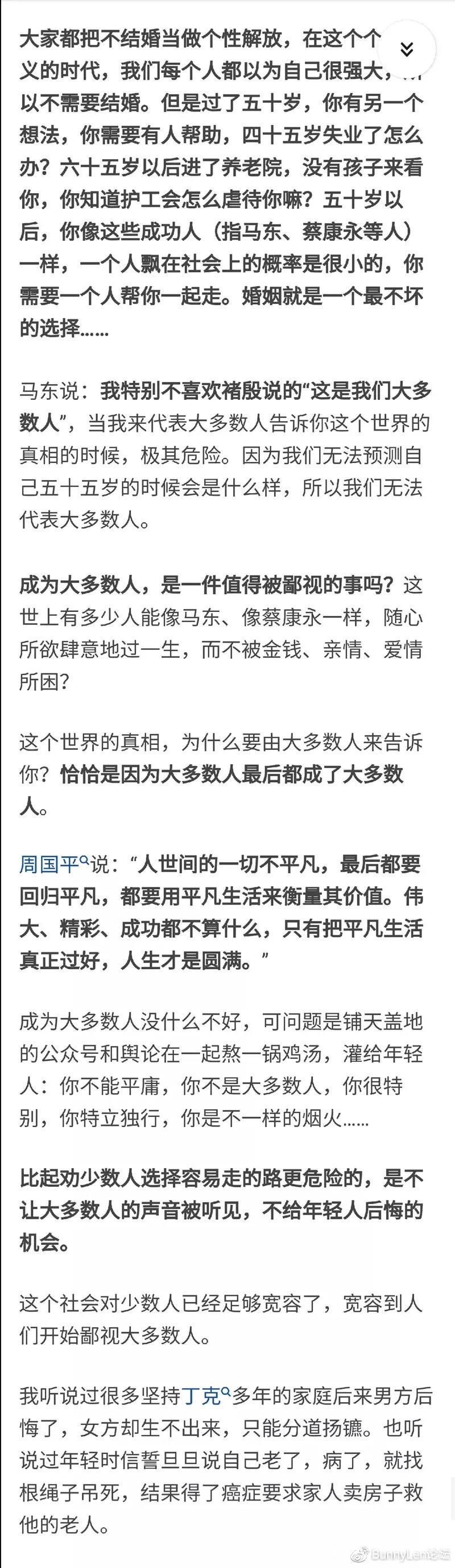 知乎上咋咋呼呼的所謂的國際二級心理諮詢師“亦君”甚至為此鼓吹道,“比起勸少數人選擇容易走的路更危險的,是不讓大多數人的聲音被聽見,不給年輕人後悔的機會”,並妄言“這個社會對少數人已經足夠寬容了,寬容到人們開始鄙視大多數人”,不以為恥地宣揚“成為大多數人沒什麼不好的”,就此拋出“大多數人論”,鼓吹平庸,不停地徵收“智商税”。