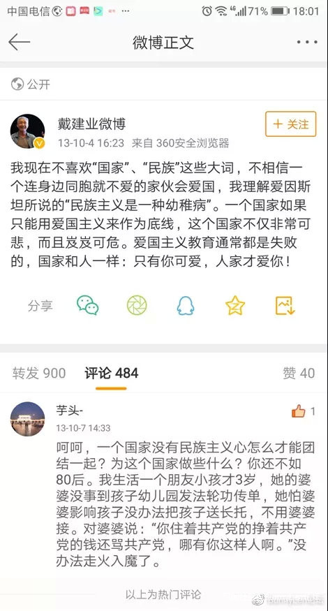 事實上,戴建業教授經常發表錯誤價值觀,不斷用庸俗現實主義和歷史虛無主義催眠包括華中師大學生在內的年輕學子,不僅曾引出奇葩言論“婚姻,就是上帝亂點鴛鴦譜,大部分都是湊合”,誤導年輕學子,傳播錯誤的價值觀念,甚至居然於不到10年前,在其個人微博大言不慚地宣傳歷史虛無主義言論,抹黑、“追殺”愛國主義: