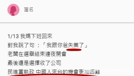 果不其然,蔡英文當選後沒幾天,媽媽就告訴她“我跟妳爸失業了”。原來其父母所在公司老闆在選舉結束當天便連夜開會,認為民進黨繼續“執政”後,“大陸人赴台機會變得渺茫”,最後決定關掉公司,因此女孩父母也瞬間變成失業人口。