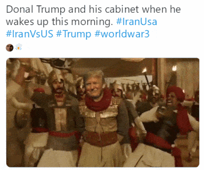 1月8號,正當梗民們的狂歡達到高潮時,伊朗方面做出了實際的反應,向美國駐伊拉克軍基地發射導彈,局勢瞬間改變了。人們意識到戰爭可能真的會發生,而不再只是個梗。網上的梗圖也出現了暫時的收斂。