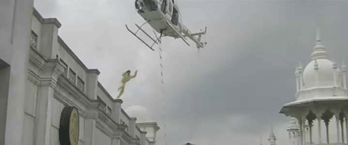 **《警察故事3:超級警察》**中,面對直升機螺旋槳氣流壓力,無任何保護,從7層樓高縱身一躍抓住繩梯。然後被吊在空中,在1000米的高中,飛了整整45分鐘!