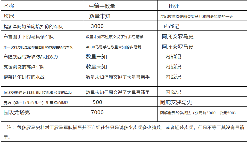 以下表是羅馬人使用弓箭手的記載的不完全統計。